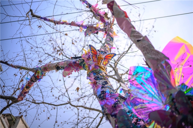 如果你从瑞金二路转入南昌路,会在起点处遇见一棵特别的梧桐树——它披着一件由各色面料混搭缝制的“抽象画外衣”。拾回的布头带着往昔的温度,与艺术家亲手设计的纹样彼此交织,肌理层叠,色彩低语。原创的3D格珊蝴蝶与幻彩蝴蝶从面料的拼贴缝隙中振翅而出,不喧哗,却在行人抬头凝望的瞬间,温柔眨眼、悄然示好。