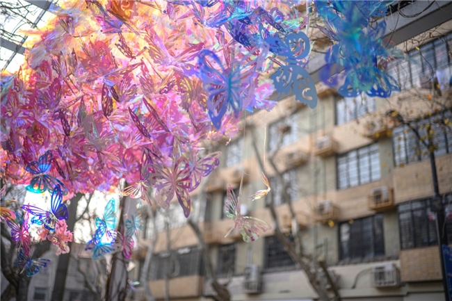 沿着树荫继续走,在最美十字路口的不远处,另一场蝶舞正在沁芳园上演。近千只蝴蝶栖息于藤蔓与花丛之间,翅纹间藏着艺术家的签名“PL”,以及“26”“乐”“Joy”的新春祝福。光影流转,蝶翼轻振,将十字路口与墙绘温柔联结。