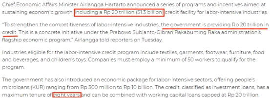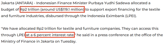 另外,印尼政府推出两项专项信贷计划扶持纺织业:一项是约13亿美元的劳动密集型产业投资信贷,为纺织、鞋类等行业提供5-8年期、5%利息补贴;另一项是约1.2亿美元的出口专项信贷,通过印尼进出口银行以6%利率支持纺织和家具企业出口。