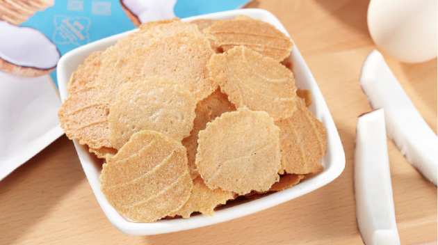 咬下去,伴随着“咔嚓咔嚓”声,薄片四散碎开。椰泰美椰子片薄脆爽口,得益于椰子薯片独特的烘焙工艺。169度的慢火烘焙工艺 ,每一片薯片都严格控制在169度40秒,恰到好处地呈现完美的薄脆口感。