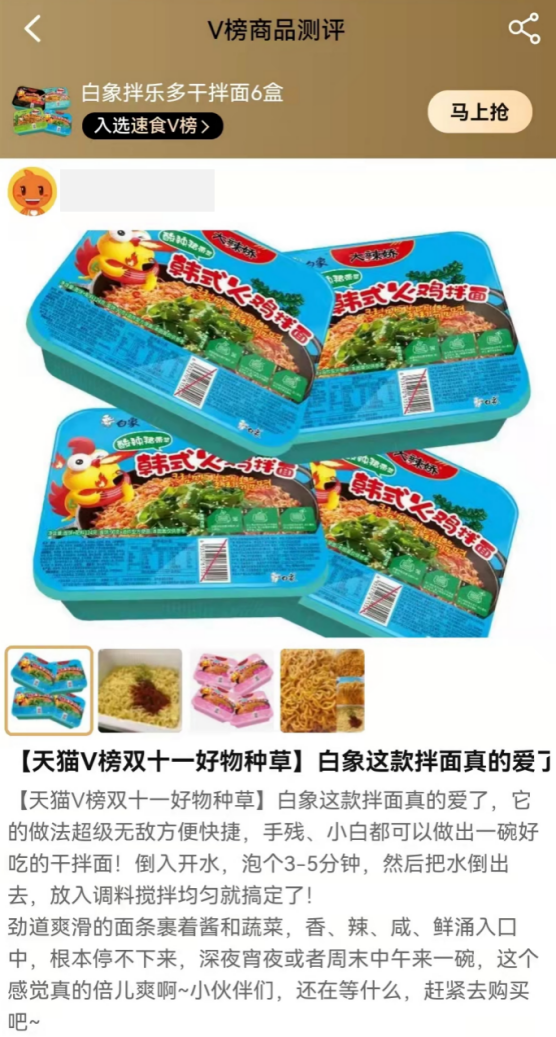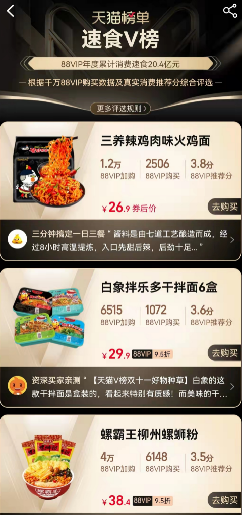 天猫商城“天猫V榜”被认为是指引消费者选购品质商品的重要风向标,今年刚刚斩获中国方便食品行业优秀创新产品大奖的白象大辣娇拌面此次上榜,可谓实至名归。