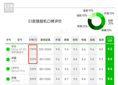 文章中,《消费者报道》分别从外观、屏幕、拍照、性能、续航和音质六个方面,对51款旗舰手机的消费者评价进行了汇总打分。从消费者评价指数来看,华为Mate 40 RS保时捷版的各项表现优秀,而荣耀V40也凭借出色的细分指数和CCR总指数紧随其后,位居榜单第二名。不过,要是综合价格等因素来看的话,荣耀V40的性价比显然更高,也更能为消费者所接受。毕竟,在综合体验和用户评价接近的情况下,两者的价差高达8400元。
