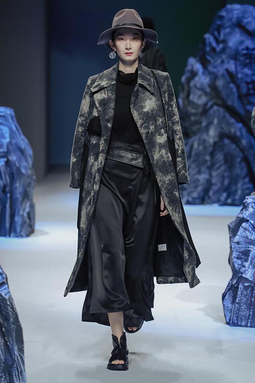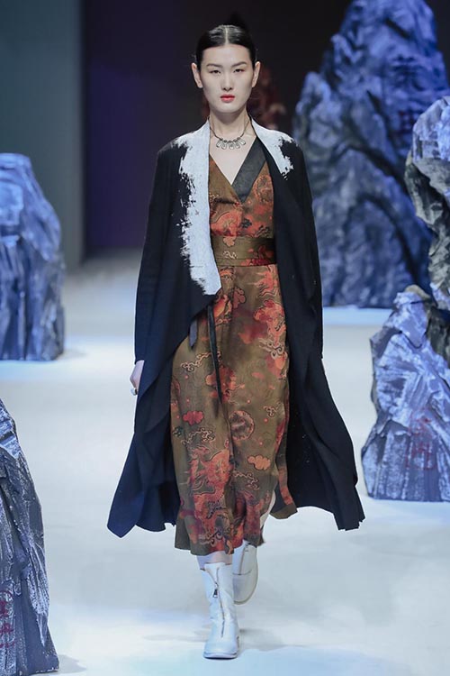 秀场现场,我们可以看到MORAN大胆的把带有仙气的高山造型搬运到了秀场,带出高处不胜寒的气魄。服装上更是搭配了夸张的饰品造型(太极手),以太极文化来贯穿整个系列。可以看出,现场的第一个波段是以非遗面料香云纱为主,而第二波段则为雅痞文艺感觉,设计师用各种重工艺来体现出茉冉一直在坚持的民族匠心精神。