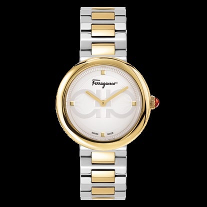 金色表圈搭配银白色日辉纹雕饰表盘,尽显独特的美学设计,表盘中心还饰有Salvatore Ferragamo 的象征标识:浮雕效果的双Gancini 标识。小时刻度盘采用4颗铆钉时标,表冠上还饰有一颗凸圆形宝石,这一珍贵细节是多款Salvatore Ferragamo 腕表上的象征标志。
