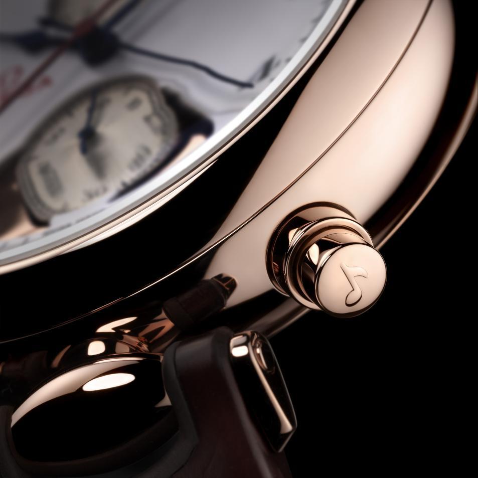 特别定制的表盒由胡桃木制成,表盒内设有云杉木制成的共振板,能够增强腕表计时报时的韵律、音调、和声以及时长,呈现出更为华美的音色。