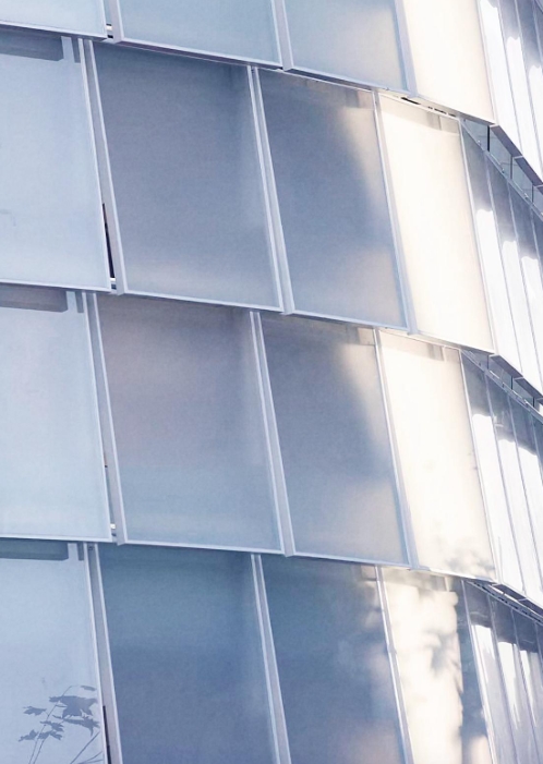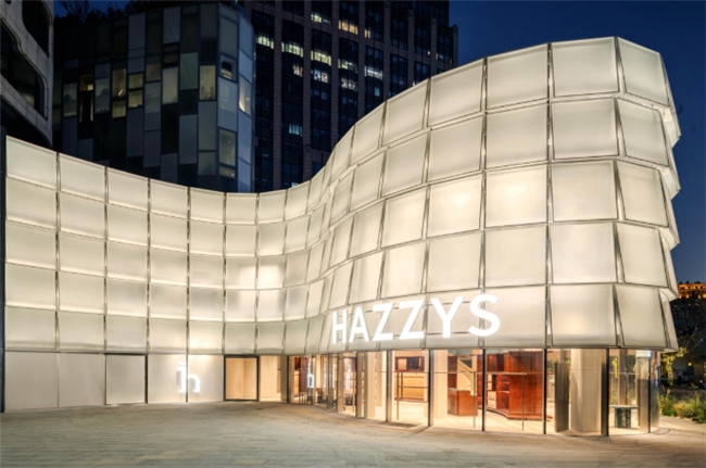 HAZZYS旗舰店坐落于上海新天地石库门建筑群中,建筑外立面采用透光玻璃饰面,将传统建筑构件转化为当代设计语言,既实现景观视线的自然过滤,又能柔和引入自然光。斜挑玻璃造型形成了一种动态建筑系统,极具视觉辨识度,犹如赛艇在水面泛起的涟漪。玻璃的半透明质感与幕墙立柱的亮光不锈钢材质也象征着水面的波光粼粼结合了传统构造建筑形态,亦深度呼应品牌核心所倡导的经典英式赛艇俱乐部文化。