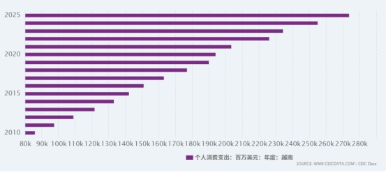 越南消费市场正步入结构性扩容阶段,内需对经济增长的支撑作用持续增强。2025年社会消费品零售总额突破7000万亿越南盾(约2690-2700亿美元),同比增长9.2%,显示出消费端的稳健活力。