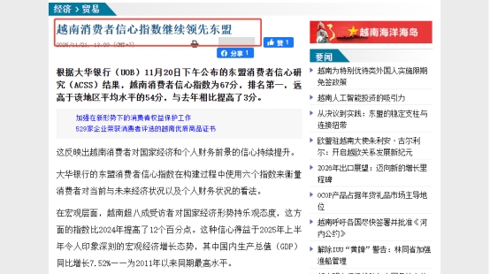 大华银行(UOB)在2025年11月公布的东盟消费者信心研究表明,越南消费者信心指数继续领先东盟。越南消费者正在从“基础型需求”迈向“品质、安全与教育并重”的新阶段,对原料、面料、辅料、家纺、服装等品类的进口需求大大提升。