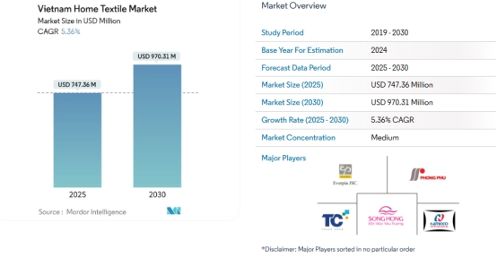 2025年越南家用纺织品市场规模为7.4736亿美元,预计到2030年将增长至9.7031亿美元,年复合增长率达5.36%。