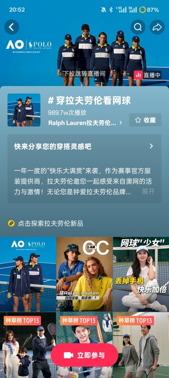 在后面的澳网直播中,品牌以“穿拉夫劳伦看网球”为叙事,自然而然地实现了联名系列的露出和种草。