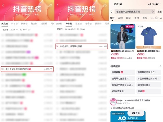 而抖音商城超级品牌日,则以生态之力,从前期与品牌内容共创、合作邀约达人矩阵种草,到明星大咖跨界互动,一系列立体化传播策略不仅营造了站内浓厚的澳网氛围,更是强力助推拉夫劳伦打破话题、声量破圈,真正实现1+1>2的效果。