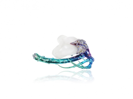 转折发生在2013年。他凭借作品《玉兰花开》和田玉项圈,一举受邀登上世界顶级珠宝展——瑞士巴塞尔钟表珠宝展的舞台,并荣登法国专业珠宝杂志《DREAMS》封面。这件作品初露其革命性锋芒:以四瓣白玉雕琢出随风摇曳的玉兰,摒弃传统主石概念,让整体线条如中国写意画般流动。更关键的是,他首次大胆地将和田玉与钛金属结合。钛金属极轻极韧,色泽可随心赋彩,它的“现代性”与和田玉的“古韵”形成了“一阴一阳,一刚一柔”的绝妙对话。国际影星苏菲·玛索的佩戴,让这件作品历史性地进入全球视野,法国《费加罗报》评论其“展现了一种无需迎合、只需真诚‘转译’的东方美学。” 这次亮相,不仅让西方珠宝界首次聚焦于中国和田玉的当代艺术表达,也标志着马瑞“东西融合”创作语言的确立。
