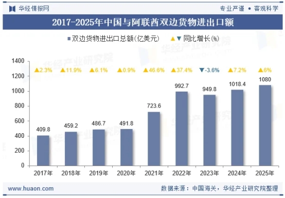 伴随区域经济韧性不断显现,中阿经贸合作持续升温。中国已连续多年保持阿联酋全球最大贸易伙伴地位,阿联酋则是中国在西亚北非的重要出口市场与核心枢纽。2024年中阿贸易额首次突破1000亿美元,2025年中国与阿联酋双边货物进出口额进一步增至1080亿美元,同比增长6%。