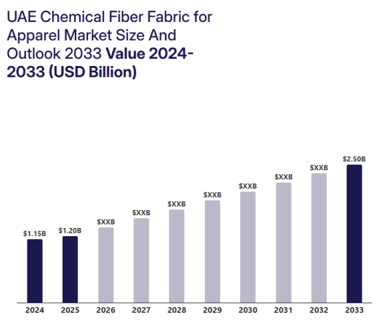 相关数据显示,2025年阿联酋服装用化学纤维面料市场价值12亿美元,预计到2033年将达到25亿美元,复合年均增长率4.8%。